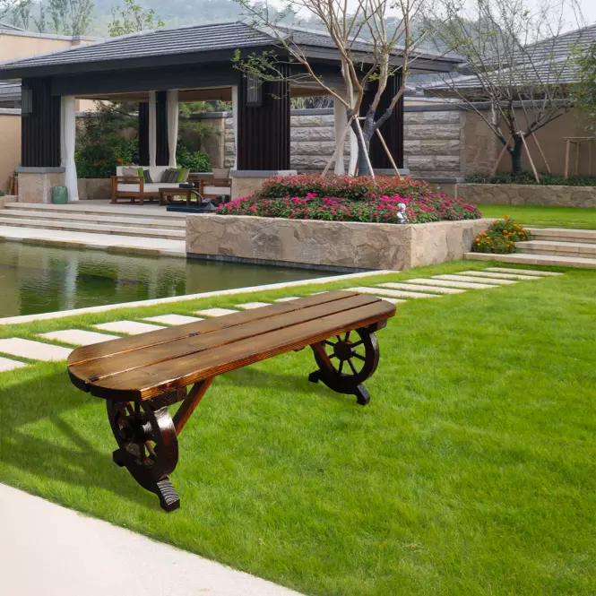 Unikatna vrtna klupa u stilu spaljenog drveta. Tamna boja sa svijetlim mrljama zasigurno je razlikuje od ostalog vrtnog namještaja. Najveća prednost su efektni mornarski kotači koji ujedno podupiru cjelinu. Klupa je postavljena na dodatne noge koje je stabiliziraju.