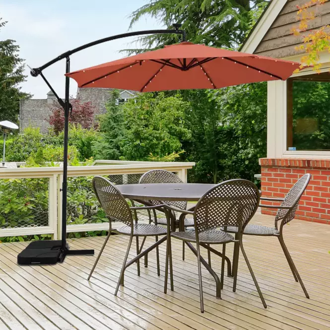 Suncobran je opremljen solarnom LED rasvjetom koja večeri provedene na otvorenom čini još ugodnijima. Na svakoj od osam rebara nalazi se po pet LED lampica. Ergonomska ručka i mehanizam s ručkom osiguravaju jednostavnu upotrebu. Standardne dimenzije, poluautomatsko otvaranje i ventilacijski otvor za dodatnu udobnost nedvojbene su prednosti ovog proizvoda. Suncobran se može slobodno prilagoditi ovisno o položaju sunca ili vašim potrebama. Osam metalnih, čvrstih rebara i okvir obojan prahom jamče stabilnost i otpornost na blage udare vjetra. Suncobran je opremljen nosačem i križnim postoljem posebno dizajniranim za njega – zahvaljujući čemu zauzima malo prostora. Set uključuje i praktičnu torbu za pohranu i transport. Presvlaka je izrađena od poliestera.